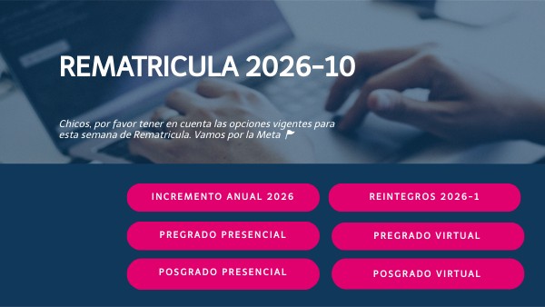 Para reintegros no se realizará recargos durante las fechas de pago. Reintegro Virtual: Iniamos solicitudes de reintegro para el 2026-1 a partir del 20 de noviembre.Recuerden que realizamos la solicitud a través de Banner, debemos dar la información clara y completa, indicarle fechas de inicio de clases, costo, resolución rectoral vigente.DTOS para los reintegros será 10% dto reintegro + dto convenio.