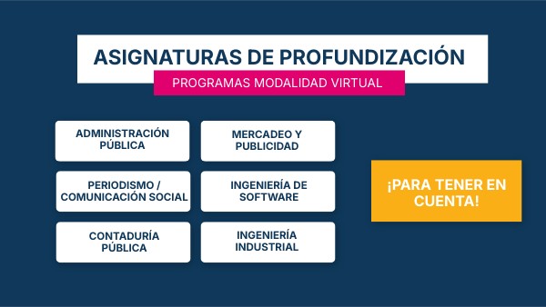 Cursando y aprobando estos tres (3) módulos cumplirás con el requisito de los ocho (8) créditos académicos que contempla la opción de grado. Estos módulos pueden ser homologados en las especializaciones ofrecidas por la Institución, siempre y cuando hayan sido cursados y aprobados satisfactoriamente. La nota final de la opción de grado corresponderá a la sumatoria de las notas de los tres módulos cursados y dividida entre tres; siempre y cuando los tres módulos hayan sido aprobados, de lo contrario, se registrará la nota menor que se haya obtenido. La nota mínima para aprobar la opción de grado es 3.0 para cada módulo.Asignaturas de Profundización