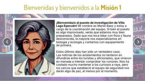 ¡Bienvenida/o al puesto de investigación de Villa Lago Epecuén! Mi nombre es Mariel Baez y estoy a cargo de la coordinación del equipo. Si bien el puesto es algo improvisado, verás que estamos muy bien preparados. Dado que nos toca lidiar con flora y fauna desconocida, la mayoría nos especializamos en biología y ecología y contamos con equipamiento de primera. Estos últimos días han sido un verdadero caos. Las noticias de los avistamientos no tardaron en difundirse entre los turistas y aficionados, que vinieron en manada a intentar comprobar los rumores. Nos ha costado mucho mantener a los curiosos a raya, pero los cercos que estableció el equipo de seguridad nos darán algo de paz, al menos por el momento.
