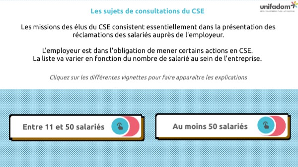 Les sujets de consultations du CSE Les missions des élus du CSE consistent essentiellement dans la présentation des réclamations des salariés auprès de l'employeur. L'employeur est dans l'obligation de mener certains actions en CSE. La liste va varier en fonction du nombre de salarié au sein de l'entreprise.