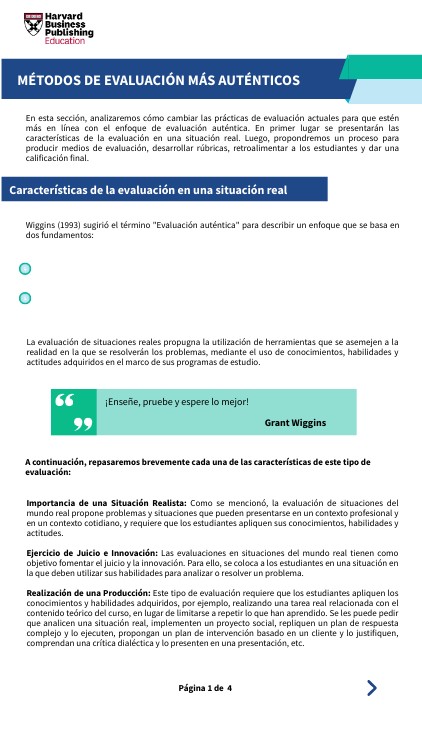 En esta sección, analizaremos cómo cambiar las prácticas de evaluación actuales para que estén más en línea con el enfoque de evaluación auténtica. En primer lugar se presentarán las características de la evaluación en una situación real. Luego, propondremos un proceso para producir medios de evaluación, desarrollar rúbricas, retroalimentar a los estudiantes y dar una calificación final.
