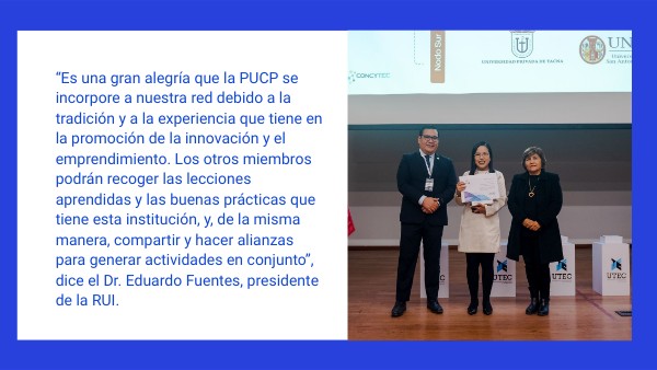 “Es una gran alegría que la PUCP se incorpore a nuestra red debido a la tradición y a la experiencia que tiene en la promoción de la innovación y el emprendimiento. Los otros miembros podrán recoger las lecciones aprendidas y las buenas prácticas que tiene esta institución, y, de la misma manera, compartir y hacer alianzas para generar actividades en conjunto”, dice el Dr. Eduardo Fuentes, presidente de la RUI.