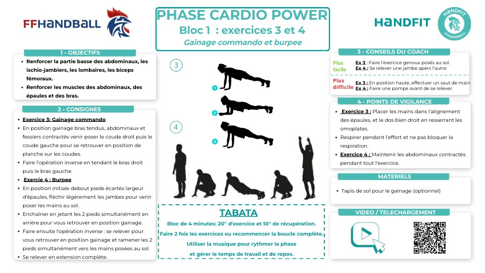 Bloc de 4 minutes: 20'' d'exercice et 10'' de récupération. Faire 2 fois les exercices ou recommencer la boucle complète. Utiliser la musique pour rythmer la phase et gérer le temps de travail et de repos.