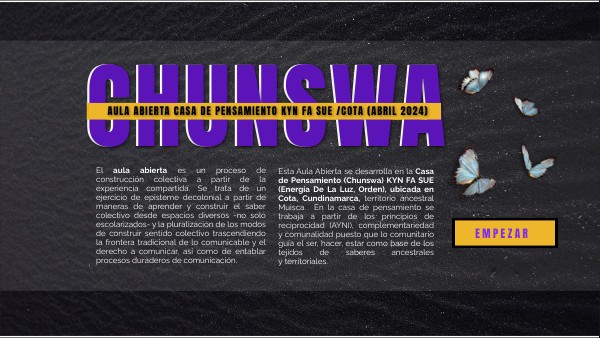Esta Aula Abierta se desarrolla en la Casa de Pensamiento (Chunswa) KYN FA SUE (Energía De La Luz, Orden), ubicada en Cota, Cundinamarca, territorio ancestral Muisca. En la casa de pensamiento se trabaja a partir de los principios de reciprocidad (AYNI), complementariedad y comunalidad puesto que lo comunitario guía el ser, hacer, estar como base de los tejidos de saberes ancestrales y territoriales.