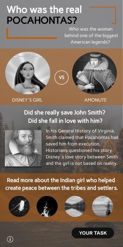 - a catchy headline revealing the lie - short description of the situation and the correct info behind the story of Pocahontas - some pictures for illustration