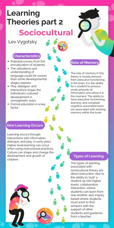 The types of learning associated with sociocultural theory are; direct instruction, due to the ability to "pull" a student up into higher levels, collaborative interaction, where students can learn from one another, also inquiry based where students must work to find answers with the support of other students and guidance from a teacher.