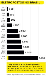 Disponíveis 622 eletropostos em Santa Catarina, ocupando a 4º posição entre os estados com maior número deste equipamento.