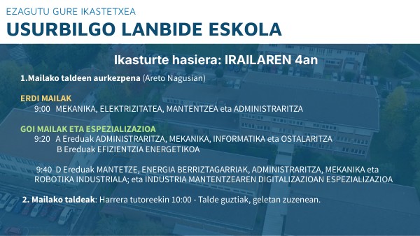 1.Mailako taldeen aurkezpena (Areto Nagusian) ERDI MAILAK9:00 MEKANIKA, ELEKTRIZITATEA, MANTENTZEA eta ADMINISTRARITZA GOI MAILAK ETA ESPEZIALIZAZIOA9:20 A Ereduak ADMINISTRARITZA, MEKANIKA, INFORMATIKA eta OSTALARITZA B Ereduak EFIZIENTZIA ENERGETIKOA 9:40 D Ereduak MANTETZE, ENERGIA BERRIZTAGARRIAK, ADMINISTRARITZA, MEKANIKA eta ROBOTIKA INDUSTRIALA; eta INDUSTRIA MANTENTZEAREN DIGITALIZAZIOAN ESPEZIALIZAZIOA 2. Mailako taldeak: Harrera tutoreekin 10:00 - Talde guztiak, geletan zuzenean.