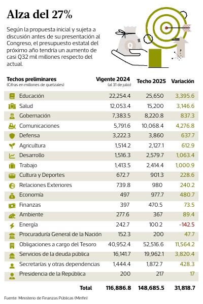 Según la propuesta inicial y sujeta a discusión antes de su presentación al Congreso, el presupuesto estatal del próximo año tendría un aumento de casi Q32 mil millones respecto del actual.