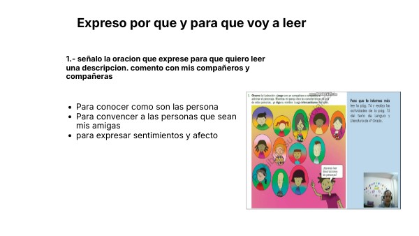 1.- señalo la oracion que exprese para que quiero leer una descripcion. comento con mis compañeros y compañeras