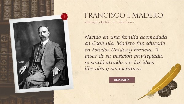 Nacido en una familia acomodada en Coahuila, Madero fue educado en Estados Unidos y Francia. A pesar de su posición privilegiada, se sintió atraído por las ideas liberales y democráticas.