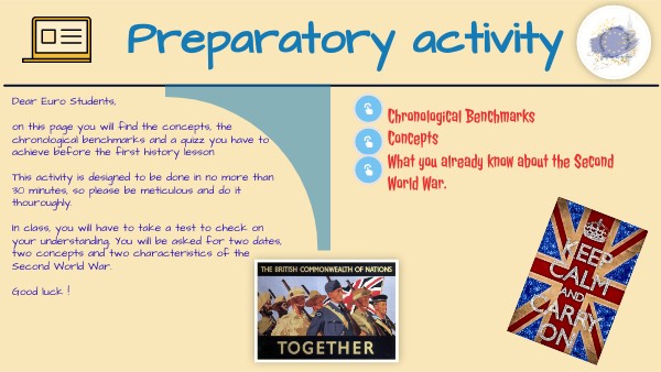 Dear Euro Students, on this page you will find the concepts, the chronological benchmarks and a quizz you have to achieve before the first history lesson This activity is designed to be done in no more than 30 minutes, so please be meticulous and do it thouroughly. In class, you will have to take a test to check on your understanding. You will be asked for two dates, two concepts and two characteristics of the Second World War. Good luck !