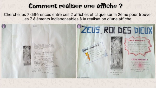 Comparer 2 affiches afin de trouver les éléments indispensables d'une affiches (jeu des 7 différences)