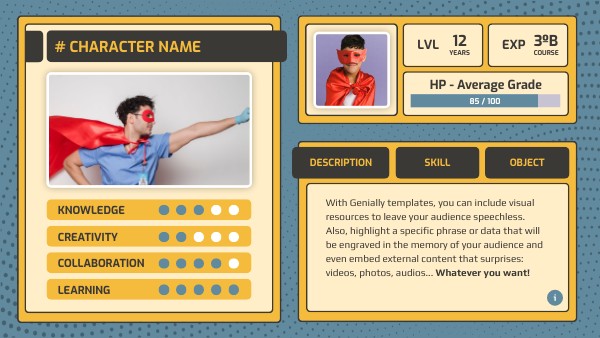 With Genially's templates you can include visual resources to leave your audience open-mouthed. You can also highlight a specific phrase or fact that will be etched in the memory of your audience and even embed external content that surprises: videos, photos, audios... Whatever you want! amazing experiences and stories.