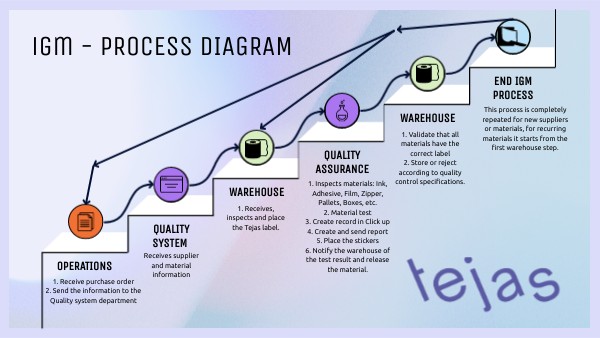 1. Inspects materials: Ink, Adhesive, Film, Zipper, Pallets, Boxes, etc. 2. Material test 3. Create record in Click up 4. Create and send report 5. Place the stickers 6. Notify the warehouse of the test result and release the material.