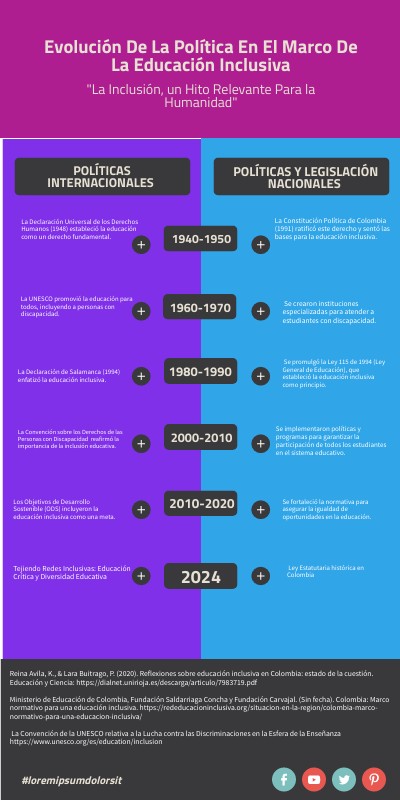 Reina Avila, K., & Lara Buitrago, P. (2020). Reflexiones sobre educación inclusiva en Colombia: estado de la cuestión. Educación y Ciencia: https://dialnet.unirioja.es/descarga/articulo/7983719.pdf Ministerio de Educación de Colombia, Fundación Saldarriaga Concha y Fundación Carvajal. (Sin fecha). Colombia: Marco normativo para una educación inclusiva. https://rededucacioninclusiva.org/situacion-en-la-region/colombia-marco-normativo-para-una-educacion-inclusiva/ La Convención de la UNESCO relativa a la Lucha contra las Discriminaciones en la Esfera de la Enseñanza https://www.unesco.org/es/education/inclusion