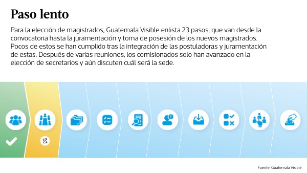 Para la elección de magistrados, Guatemala Visible enlista 23 pasos, que van desde la convocatoria hasta la juramentación y toma de posesión de los nuevos magistrados. Pocos de estos se han cumplido tras la integración de las postuladoras y juramentación de estas. Después de varias reuniones, los comisionados solo han avanzado en la elección de secretarios y aún discuten cuál será la sede.