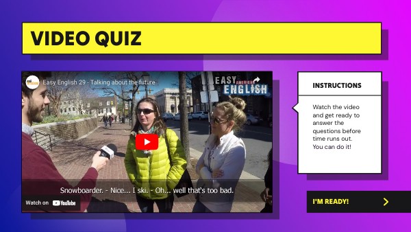 Watch the video and get ready to answer the questions before time runs out.You can do it!