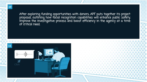 After exploring funding opportunities with donors, APF puts together its project proposal, outlining how facial recognition capabilities will enhance public safety, improve the investigative process and boost efficiency in the agency at a time of critical need.
