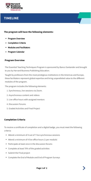 The Essential Teaching Techniques Program is sponsored by Banco Santander and brought to you by Harvard Business Publishing Education. Taught by professors from the most prestigious institutions in the Americas and Europe, these facilitators represent global expertise and bring unparalleled value to the different modules of the program. The program includes the following elements: