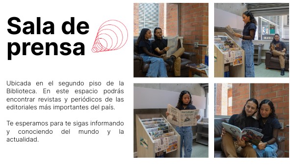 Ubicada en el segundo piso de la Biblioteca. En este espacio podrás encontrar revistas y periódicos de las editoriales más importantes del país. Te esperamos para que te sigas informando y conociendo del mundo y la actualidad.