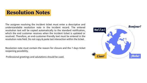 The assignee resolving the incident ticket must enter a descriptive and understandable resolution note in the incident record. The entered resolution text will be copied automatically to the standard notification, which the end customer receives when the incident ticket is updated or resolved. Therefore, an end-customer-friendly text must be entered in the resolution note field. Do not copy & paste last interaction within the ticket. Resolution note must contain the reason for closure and the 7 days ticket reopening possibility. Professional greetings and salutations should be used.