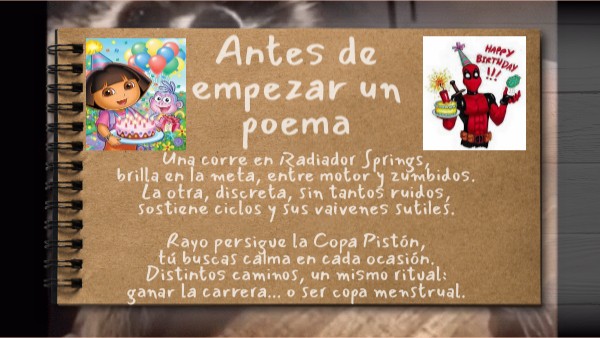 Una corre en Radiador Springs,brilla en la meta, entre motor y zumbidos. La otra, discreta, sin tantos ruidos, sostiene ciclos y sus vaivenes sutiles. Rayo persigue la Copa Pistón, tú buscas calma en cada ocasión. Distintos caminos, un mismo ritual: ganar la carrera... o ser copa menstrual.