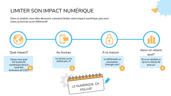 Dans ce module, vous allez découvrir comment limiter votre impact numérique, que vous soyez au bureau ou en télétravail!