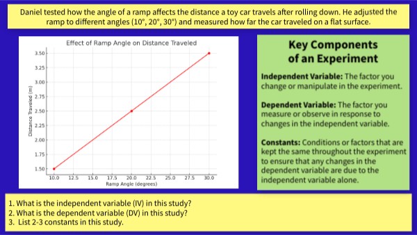 Daniel tested how the angle of a ramp affects the distance a toy car travels after rolling down. He adjusted the ramp to different angles (10°, 20°, 30°) and measured how far the car traveled on a flat surface.