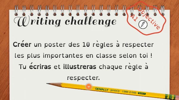 Créer un poster des 10 règles à respecter les plus importantes en classe selon toi !Tu écriras et illustreras chaque règle à respecter.
