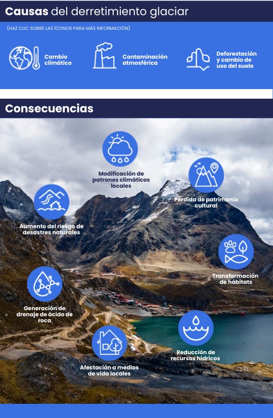 Afectación a medios de vida locales: las comunidades que dependen del agua glaciar para la agricultura, el turismo y otras actividades económicas pueden verse gravemente afectadas. La alta vulnerabilidad de poblaciones andinas en combinación con la reducción de glaciares, alteración del ciclo hidrológico y cambios en la calidad de agua pueden provocar inseguridad alimentaria, hídrica y consecutivas pérdidas económicas.