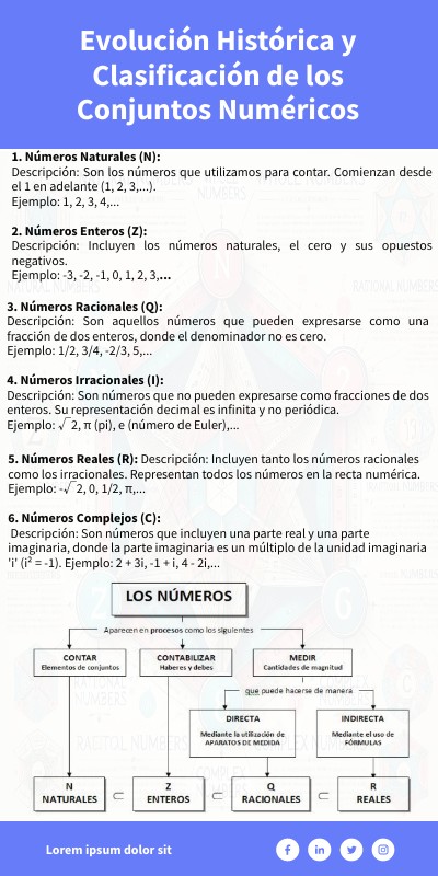 5. Números Reales (R): Descripción: Incluyen tanto los números racionales como los irracionales. Representan todos los números en la recta numérica. Ejemplo: -√2, 0, 1/2, π,... 6. Números Complejos (C): Descripción: Son números que incluyen una parte real y una parte imaginaria, donde la parte imaginaria es un múltiplo de la unidad imaginaria 'i' (i² = -1). Ejemplo: 2 + 3i, -1 + i, 4 - 2i,...