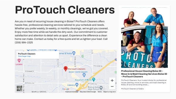 Are you in need of recurring house cleaning in Boise? ProTouch Cleaners offers hassle-free, professional cleaning services tailored to your schedule and needs. Whether you prefer weekly, bi-weekly, or monthly cleanings, we've got you covered. Enjoy more free time while we handle the dirty work. Our commitment to customer satisfaction and attention to detail sets us apart. Experience the difference a clean home can make. Contact us today for a free quote and let us lighten your load. Call (208) 994-1525