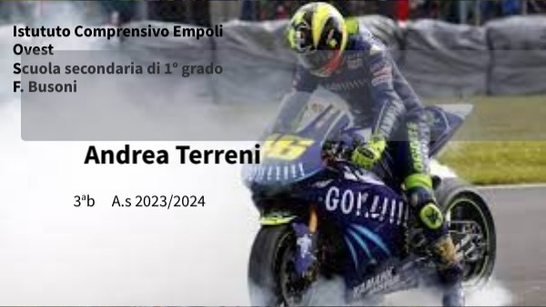Bonjour je m'appelle Andrea Terreni et comme sujet pour l'examen j'ai choisis Valentino Rossi parce que j'aime la moto et la voiture et parce que quand il courait j'étais toujours attaché à la television. J'espèrais tous les dimanches qu'il gagne et Je me suis attristè très quand il pris sa retraite. Cette passion m'a ètè trasfèrèè mon père et mon grand-père. En fait, j'ai lu autobiographie et je l'ai beaucoup aimèe.