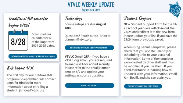 Course setups are due August 20th. Questions? Reach out to Brian at bfarnum@vtvlc.org