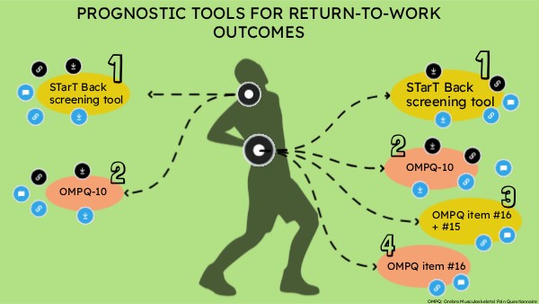 #15 In your view, how large is the risk that your current pain may become persistent? #16 In your estimation, what are the chances that you will be able to work in six months? Return to work at three months - AUC = 0.77 (0.68 to 0.86) Time to return-to-work - C-statistic = 0.72 (0.64 to 0.79)