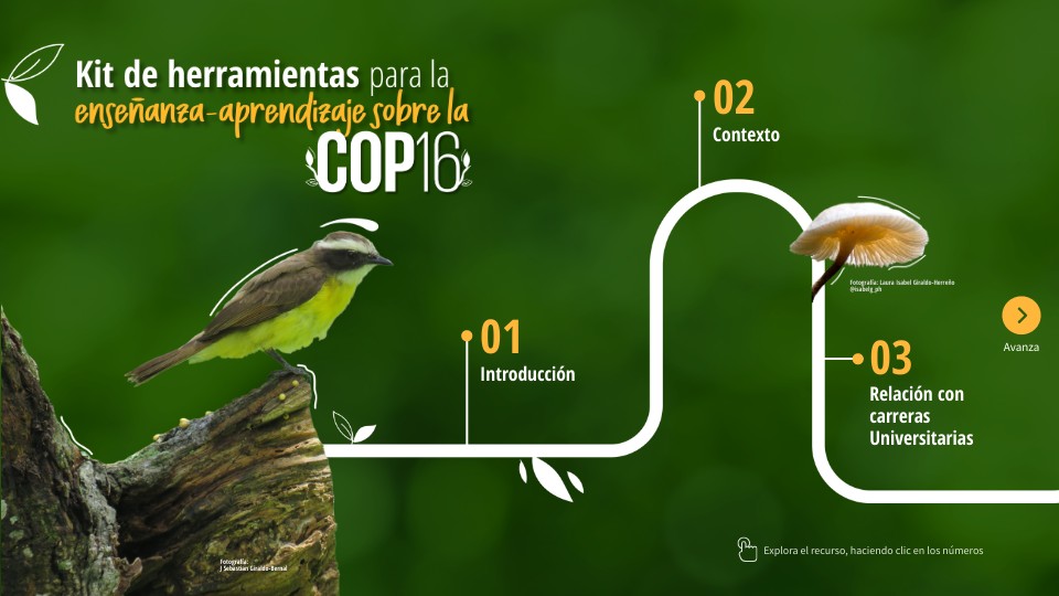 Este producto interactivo proporciona herramientas para la enseñanza y aprendizaje, tanto de los profesores universitarios interesados en integrar las temáticas de la COP16 y la biodiversidad en los programas de estudio de sus asignaturas, como para los estudiantes que desean conocer y aprender acerca de ambos temas. La relación entre estas áreas y las diferentes carreras universitarias ofrece una oportunidad para enriquecer conocimientos y fomentar una comprensión más profunda de los desafíos ambientales actuales, para los profesores y estudiantes.