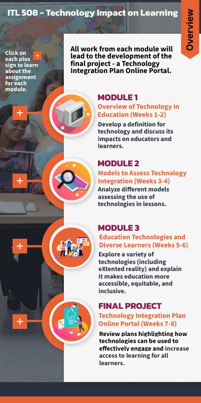 All work from each module will lead to the development of the final project - a Technology Integration Plan Online Portal.