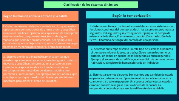 1.-Sistemas lineales: Matemáticamente son los que pueden representarse por ecuaciones de primer orden y su gráfica siempre es una línea. Ejemplo; una aplicación de este tipo de sistemas son los componentes mecánicos de alguna máquina que permiten su movimiento, por ejemplo, los actuadores, que son dispositivos que transforman la energía eléctrica en mecánica para mover el brazo de un robot.