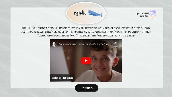 האמונה נותנת לאדם כוח. הרבה פעמים אנחנו מתמודדים עם אתגרים, ומרגישים שעומדים להתמוטט ואין בנו את הכוחות. האמונה פירושה להשיל את הדאגות מאיתנו, לדעת שמה שיקרה יקרה לטובה ולשחרר. הקשיבו לשיר הבא, שבוצע על ידי ילדי המפונים במלחמת "חרבות ברזל". אילו מילים מהשיר תפסו אתכם?