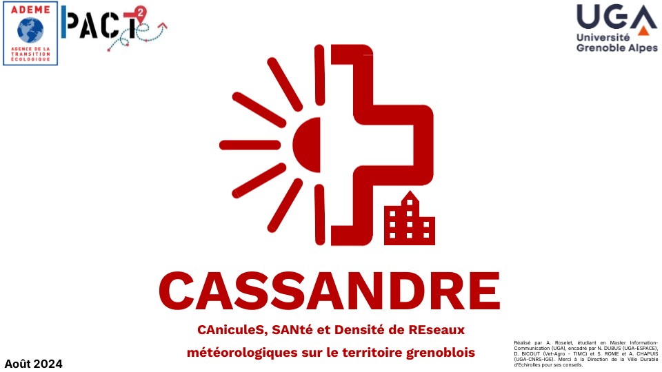 - Rome, S., Foissard, X., Bigot, S., Fouvet, A., Rousset, E., Lepeule, J., Bicout, D. J., & Dubus, N. (2022, July 6). Enjeux et objectifs du projet CASSANDRE (CAniculeS, SANté et Densité de REseaux météorologiques sur le territoire grenoblois). https://shs.hal.science/halshs-03763758/