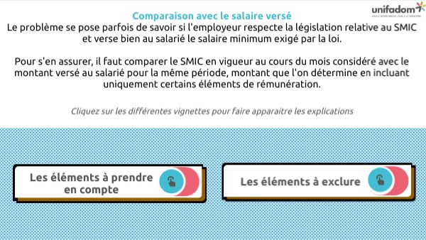 Comparaison avec le salaire versé Le problème se pose parfois de savoir si l'employeur respecte la législation relative au SMIC et verse bien au salarié le salaire minimum exigé par la loi. Pour s'en assurer, il faut comparer le SMIC en vigueur au cours du mois considéré avec le montant versé au salarié pour la même période, montant que l'on détermine en incluant uniquement certains éléments de rémunération.