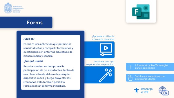 ¿Qué es? Forms es una aplicación que permite al usuario diseñar y compartir formularios y cuestionarios en entornos educativos de manera rápida y sencilla. ¿Por qué usarla? Permite sondear en tiempo real la participación de tus estudiantes dentro de una clase, a través del uso de cualquier dispositivo móvil, y luego proyectar los resultados. Esto también posibilita retroalimentar de forma inmediata.