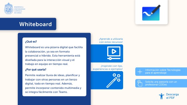 ¿Qué es? Whiteboard es una pizarra digital que facilita la colaboración, ya sea en formato presencial o híbrido. Esta herramienta está diseñada para la interacción visual y el trabajo en equipo en tiempo real. ¿Por qué usarla? Permite realizar lluvia de ideas, planificar y trabajar con otras personas en un lienzo digital, todo en tiempo real. Además, permite incorporar contenido multimedia y se integra fácilmente con Teams.