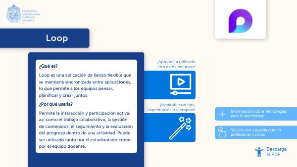 ¿Qué es? Loop es una aplicación de lienzo flexible que se mantiene sincronizada entre aplicaciones, lo que permite a los equipos pensar, planificar y crear juntos. ¿Por qué usarla? Permite la interacción y participación activa, así como el trabajo colaborativo, la gestión de contenidos, el seguimiento y la evaluación del progreso dentro de una actividad. Puede ser utilizado tanto por el estudiantado como por el equipo docente.