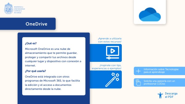 ¿Qué es? Microsoft OneDrive es una nube de almacenamiento que te permite guardar, proteger y compartir tus archivos desde cualquier lugar y dispositivo con conexión a internet. ¿Por qué usarla? OneDrive está integrado con otros programas de Microsoft 365, lo que facilita la edición y el acceso a documentos directamente desde la nube.