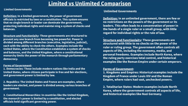 Unlimited Governments Definition: In an unlimited government, there are few or no restrictions on the powers of the government or its leaders. This often leads to a concentration of power in the hands of a single ruler or a small group, with little regard for individual rights or the rule of law. Structure and Functionlaity: These governments are structured with little to no checks on the power of the ruler or ruling group. The government often controls all aspects of life, including the economy, media, and personal freedoms. Examples include North Korea, where the ruling party exercises total control, and historical examples like the Roman Empire under certain emperors. Forms of Government: 1. Kingdoms and Empires: Historical examples include the Kingdom of France under Louis XIV and the Roman Empire, where rulers had vast, unchecked powers. 2. Totalitarian States: Modern examples include North Korea, where the government controls all aspects of life, and historical examples like Nazi Germany.
