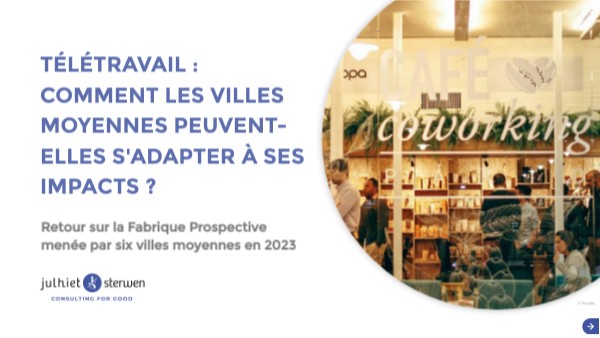 L’Agence nationale de la cohésion des territoires (ANCT), avec le co-financement d’Action logement, et en partenariat avec l’Ademe, France Tiers-lieux, le Puca et Villes de France, a lancé en mai 2022 une Fabrique Prospective visant à identifier comment les villes moyennes pouvaient s’adapter à la pratique du télétravail et en tirer des opportunités dans une perspective de transition écologique.