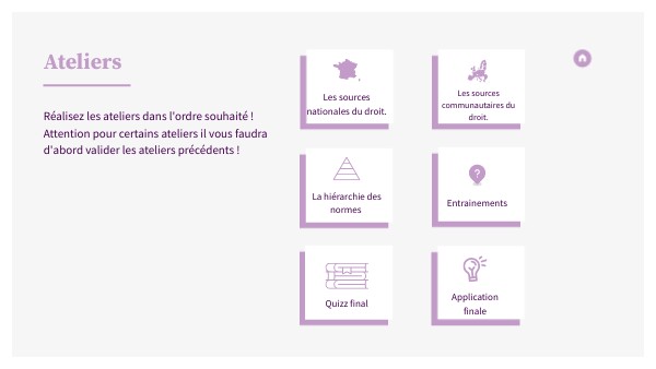 Réalisez les ateliers dans l'ordre souhaité ! Attention pour certains ateliers il vous faudra d'abord valider les ateliers précédents !