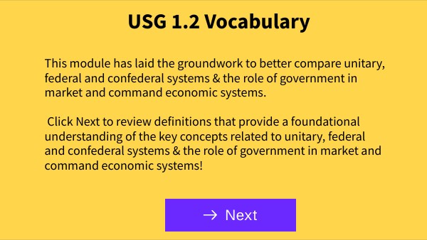 This module has laid the groundwork to better compare unitary, federal and confederal systems & the role of government in market and command economic systems. Click Next to review definitions that provide a foundational understanding of the key concepts related to unitary, federal and confederal systems & the role of government in market and command economic systems!